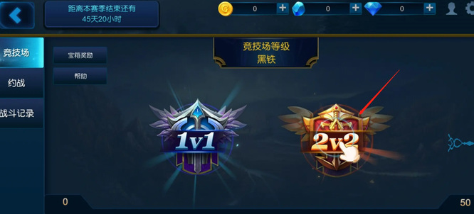 2、然后点击竞技场进入,在里面选择2v2对战进入。
