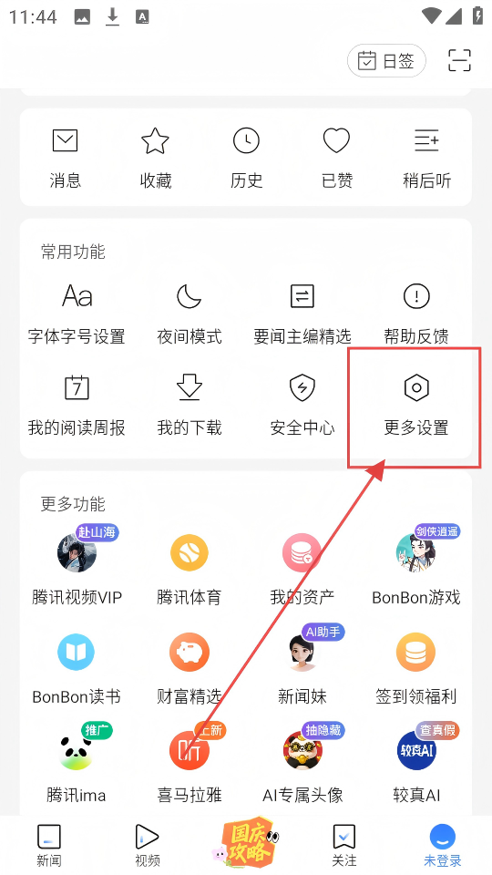 1、在功能汇总页,点击【更多设置】,进入设置界面,这里能对应用各项设置进行调整,很方便呢。