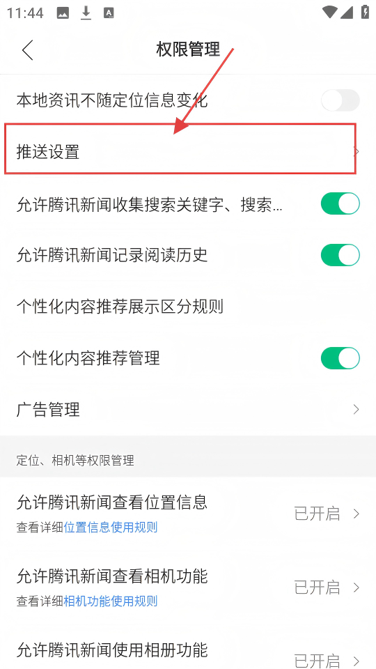 3、在权限管理中,找到【推送设置】,点击进入能设置资讯等内容的推送规则,超贴心的。