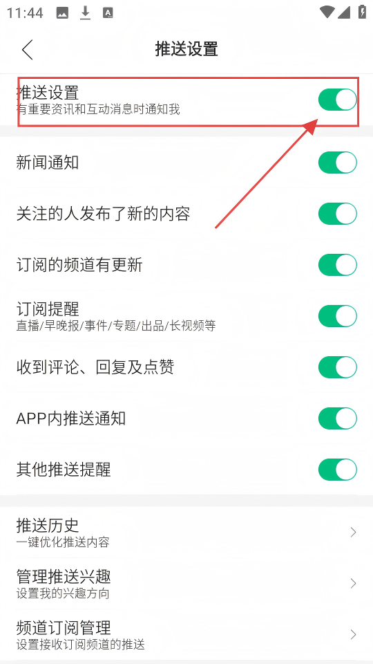 4、进入推送设置,找到【推送设置】开关,按需开启或关闭,就能决定是否接收重要资讯和互动消息啦。