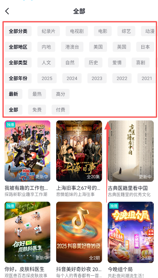 4、使用分类功能可以精准查找内容,进入全部分类后能按类型、地区、年份等条件筛选,多种筛选条件能帮你快速找到想看的内容。