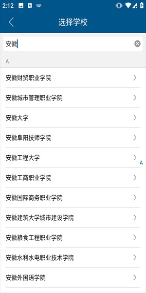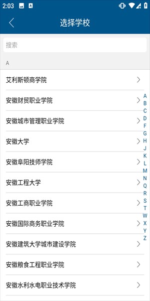 2、点击选择自己的学校可以看见有很多的学校,如果没有找到自己的学校可以点击上方的搜索栏。