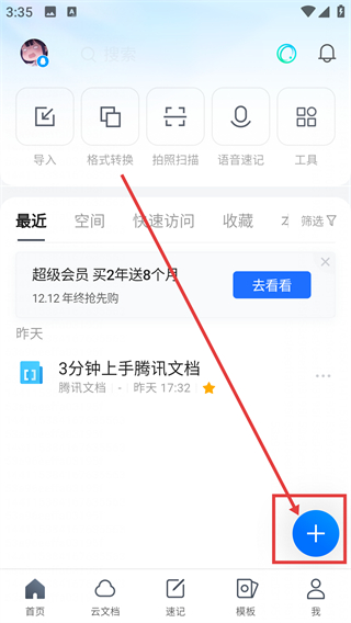 1、在腾讯文档首页,点右下角蓝色加号按钮,能展开新建文档的类型选择面板,开启创作流程哦。