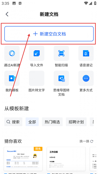 3、进入新建文档页后,点【新建空白文档】按钮,就能创建一个全新的空白文档开始编辑啦。