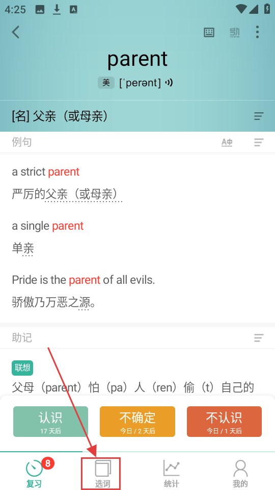 3、背单词的页面中,提供了详细的注解,还有例句的应用,帮助用户加深对该单词的理解,学完后,点击左下角的【认识】即可。