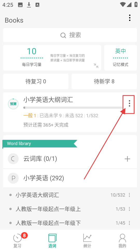 2、进入词书管理页面后,找到要更换的词书,点击其右侧的三点图标,弹出操作选项啦。