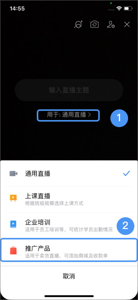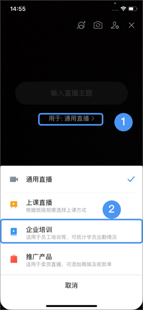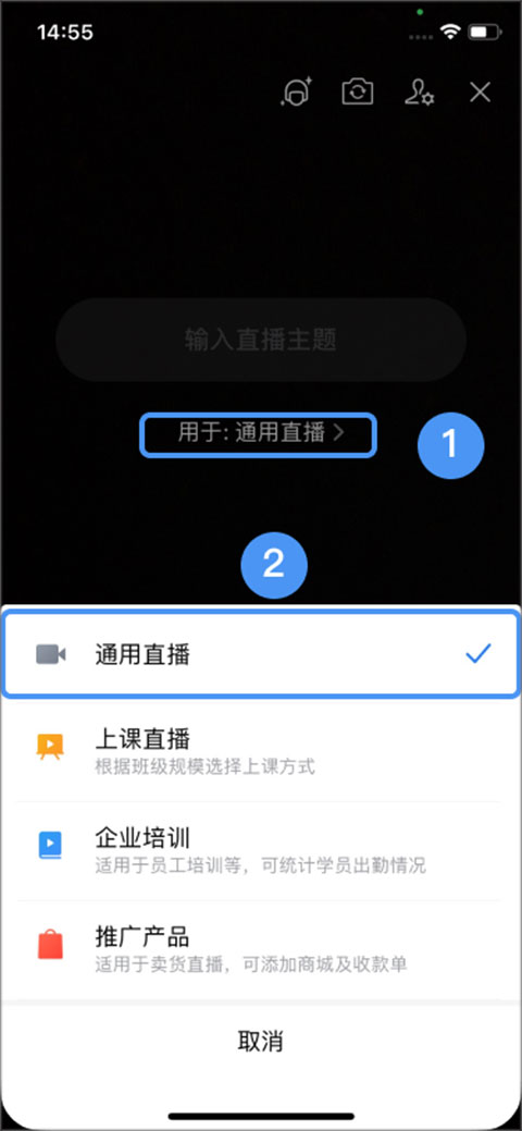 直播有【通用直播】、【企业培训】、【活动直播】、【推广直播】这几种类型: