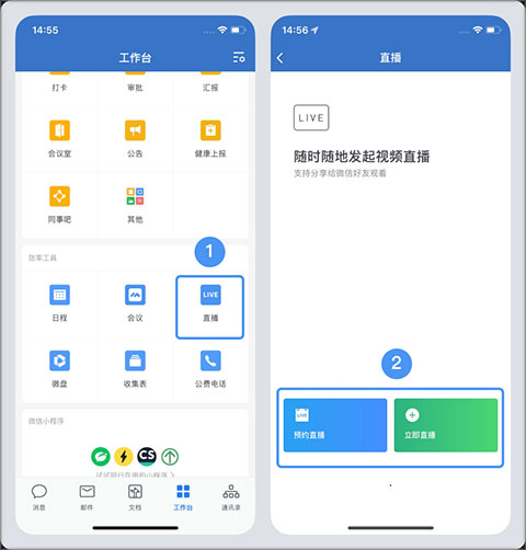 注:家校企业群聊发起的直播支持预约,工作台发起的直播暂不支持预约。
