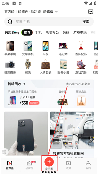 1、打开转转app,点击底部【+】号,进入卖闲置界面。