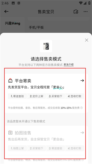 4、进入售卖模式页后,可选【平台寄卖】这类模式,按流程操作就能托管宝贝等待售卖啦。