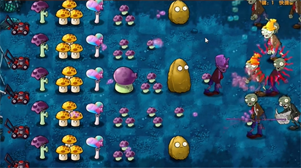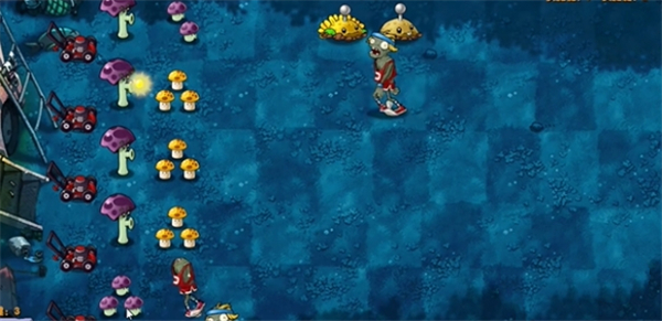 2、先在左侧种植一列胆小菇和一列阳光菇,在一路种植两个土豆雷。