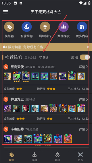 1、在攻略页能看到推荐阵容列表,像【至高天使】这类S级阵容,点详情就能查看它的配置玩法啦。