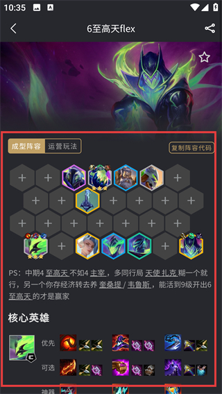 2、进入阵容详情页后,能看成型阵容站位、运营玩法,还有核心英雄的装备推荐,方便照着搭配哦。
