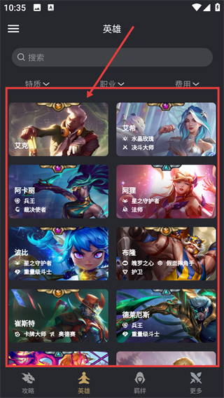 3、点底部【英雄】选项进入英雄页,能浏览所有英雄,还可按特质、职业筛选,快速找目标英雄啦。