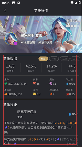 4、进入英雄详情页后,能看【寒冰射手-艾希】的登场率、技能效果等数据,助力阵容搭配决策哦。