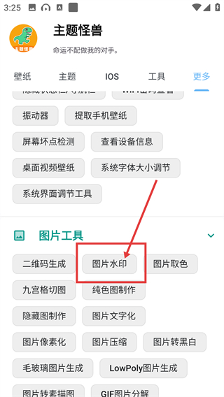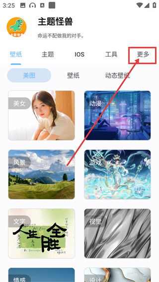 1、在【主题怪兽】主页面点击顶部的【更多】选项,就能进入功能扩展页面,查看更多工具类功能啦。