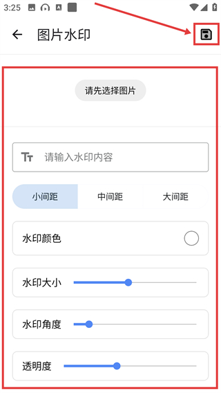 3、在图片水印页点击右上角的文件图标选择图片,再输入水印内容、调整间距等参数,就能定制水印啦。