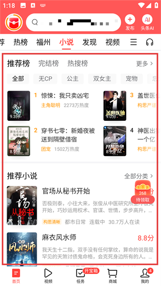 2、进入小说页后,能看到推荐榜等分类下的小说列表,点心仪的小说卡片就能进入详情页哦。