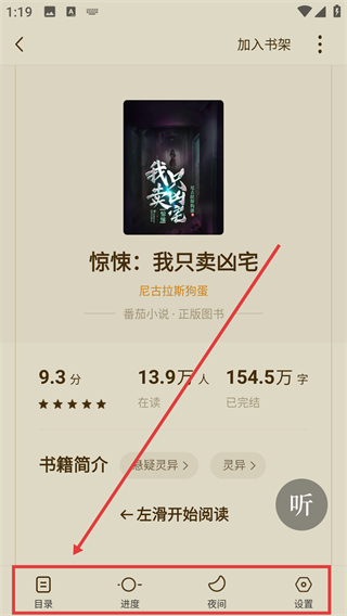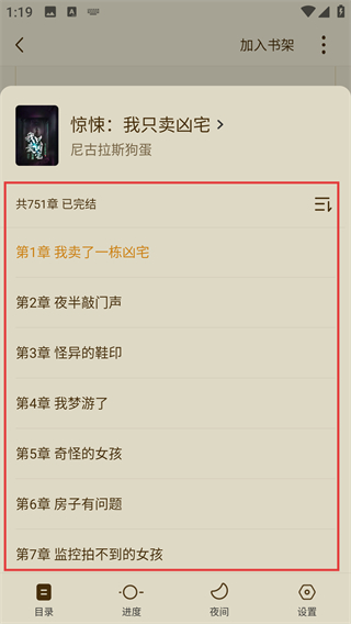 3、进入小说详情页后,点底部【目录】按钮,就能展开章节列表,方便选择想阅读的章节啦。