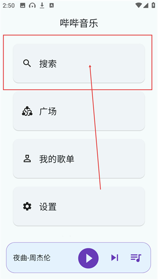 1、在【哔哔音乐】主界面点击【搜索】按钮,就能进入搜索页面,准备输入想要查找的歌曲啦。