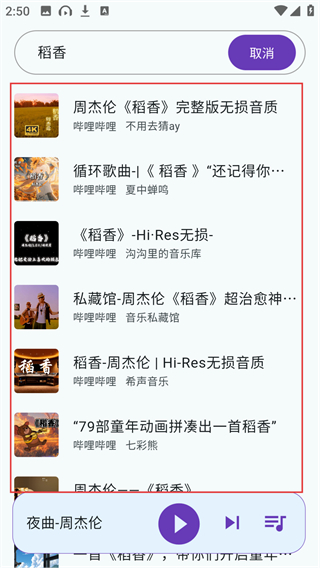 2、进入搜索页面后在输入框填写歌曲名(比如“稻香”),就能获取对应的搜索建议,快速找到目标啦。