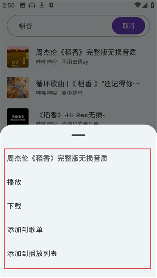 3、输入关键词后会显示相关搜索结果列表,选择目标歌曲条目,就能查看该歌曲的操作选项啦。