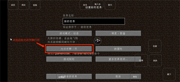 1、创建世界时要将允许作弊改为开,再点击创建世界