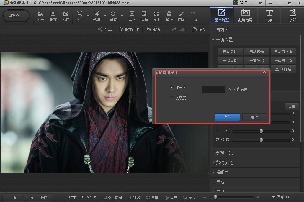 一、用光影魔术手打开一张图片,点击上方选择框中的【尺寸】,可以根据需要点击【添加常用尺寸】。