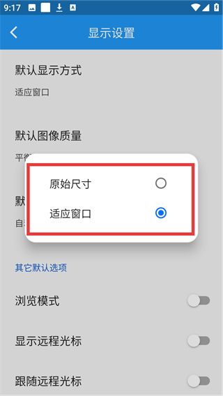 4、在显示方式弹窗里选择想要的模式,比如【适应窗口】,就能完成默认显示方式的设置啦。