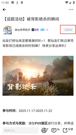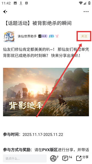 2、在活动详情页点击右上角【关注】,即可关注该官方账号,后续能收到它的动态啦。