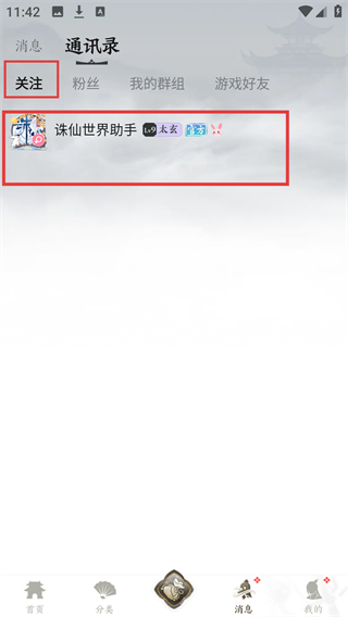 4、进入【消息】界面的【关注】列表,就能看到刚关注的【诛仙世界助手】账号啦。