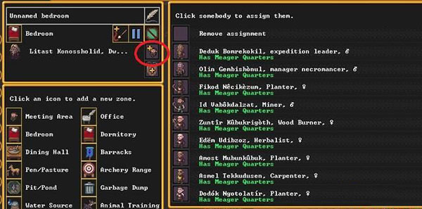 5、可以随时在区域菜单中将个人房间分配给任意矮人,拥有个人房间的矮人心情下降速度会比使用宿舍的矮人稍慢。