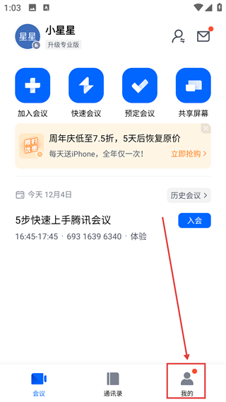 1、在会议页点底部【我的】选项,能进入个人中心界面,后续可找到个人会议室等功能入口啦。