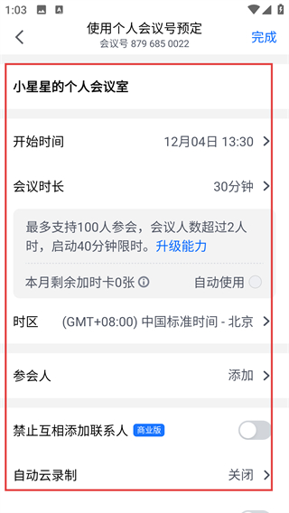4、进入预定界面后,可设置【开始时间】【会议时长】等参数,填好后点完成就能预定会议啦。