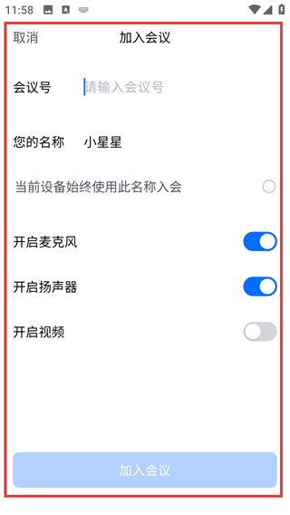 2、进入加入会议页后,输入会议号并确认参会信息,点击【加入会议】就能进入对应的会议啦。