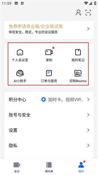 4、在我的页面可看到【个人会议室】【录制】等功能,点击对应选项就能使用这些会议辅助功能啦。