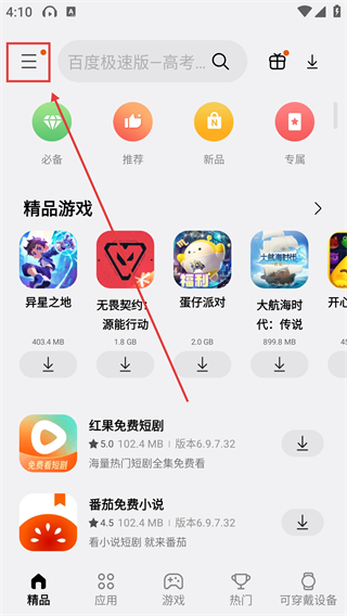 1、在应用商店首页点左上角的菜单按钮,能展开侧边栏,后续可进入设置相关功能页面啦。