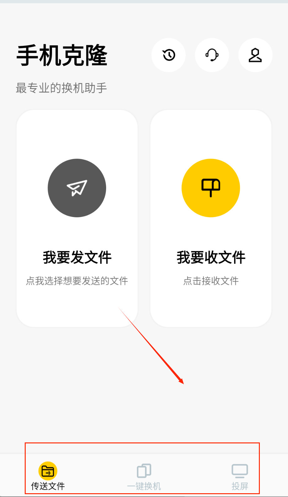 1、首次使用建议先熟悉界面布局,底部有三个选项卡:传送文件、一键换机、投屏。根据你的需求选择不同功能模式,切换起来很顺畅。