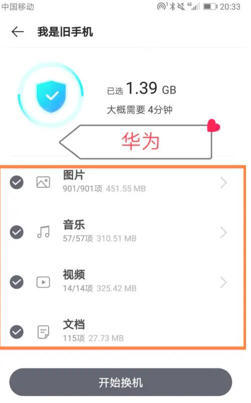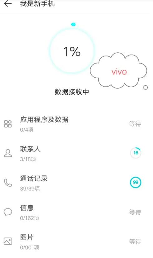 6、在华为手机中,选择需要传输的数据,点击“开始换机”,此时回到vivo手机中,可以看到页面显示文件传输的进度;
