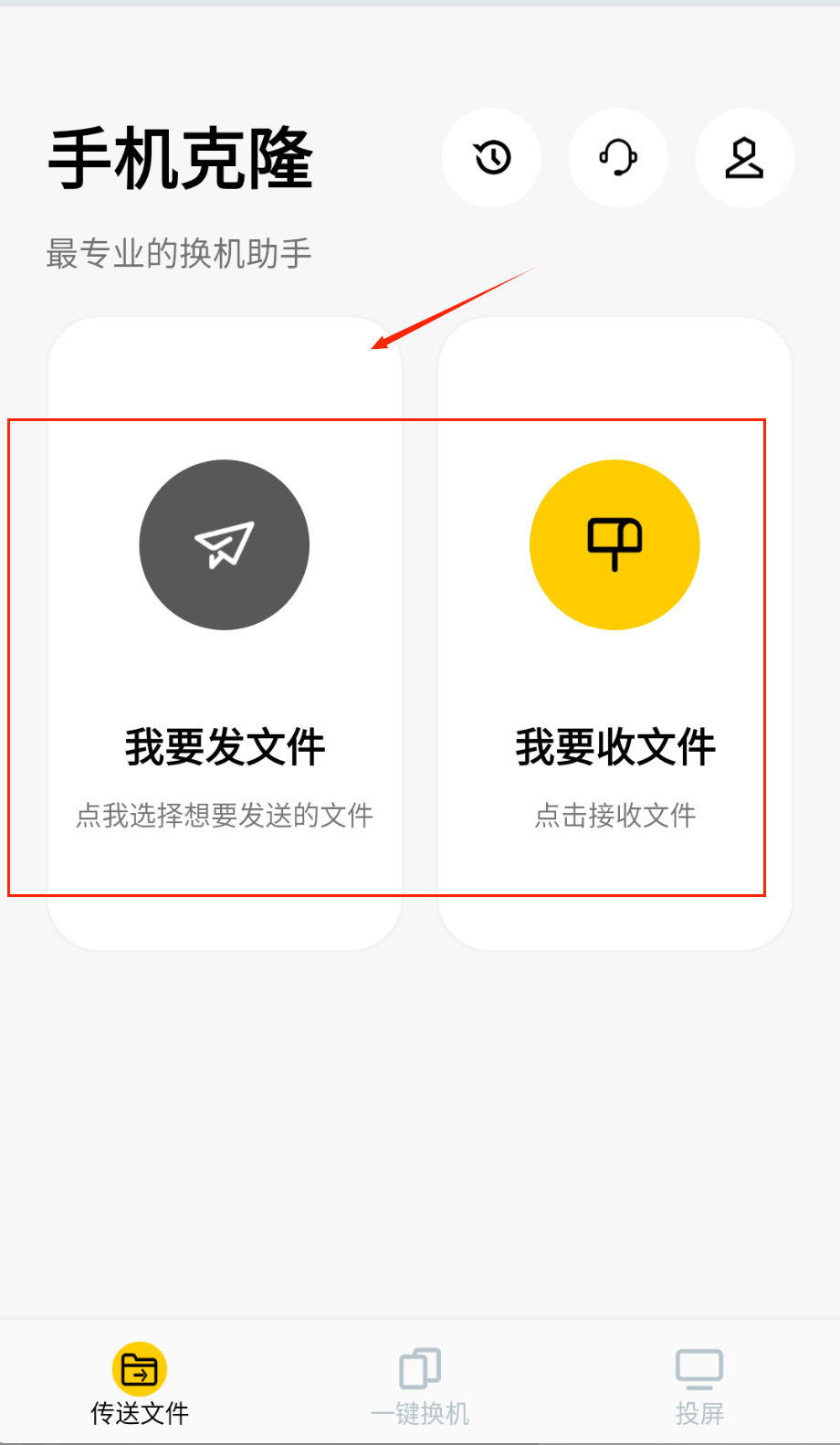 1、基础文件传输很简单,主界面清晰分为发送和接收两个区域。想发送文件就点左边灰色区域,想接收就点右边黄色区域。