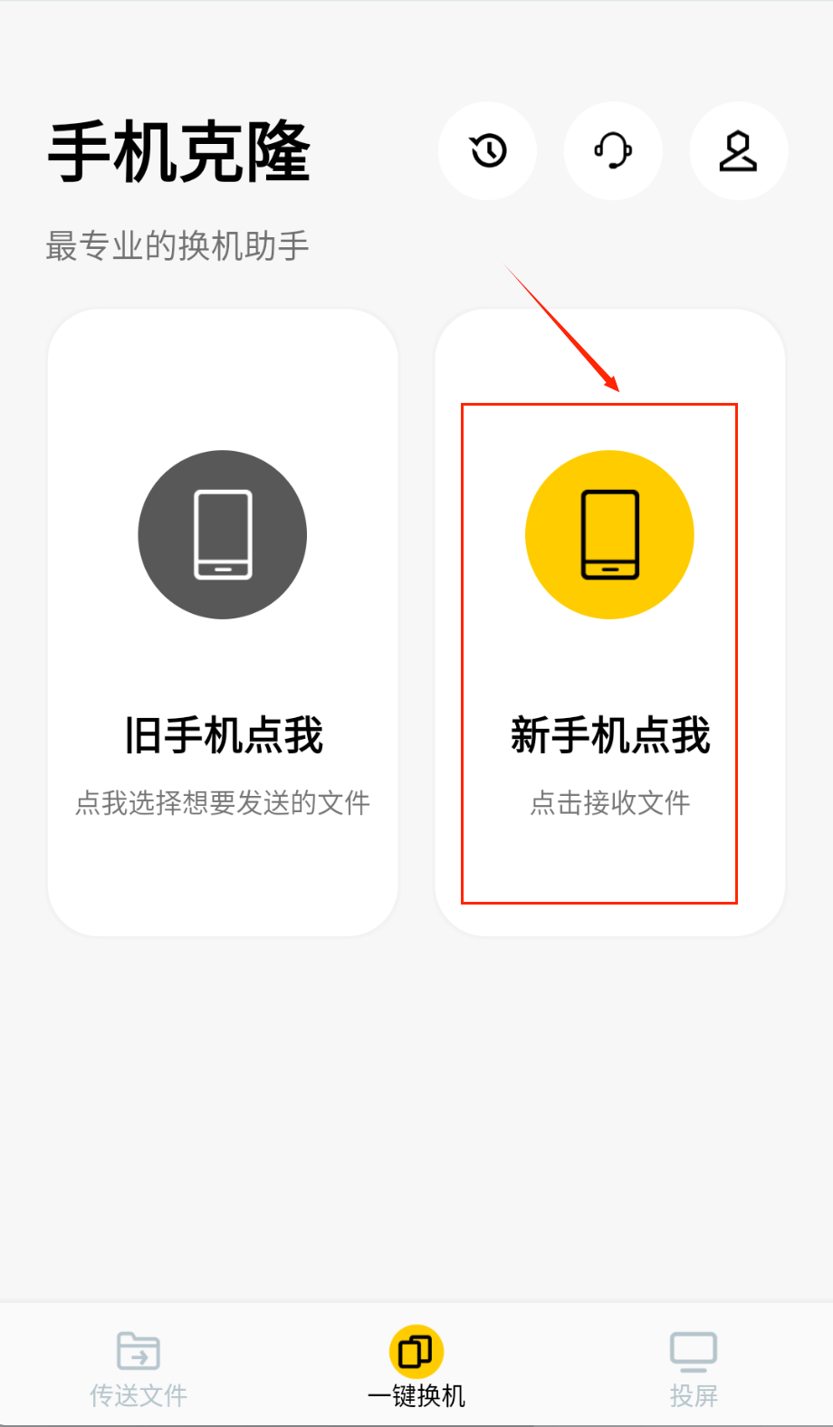 2、一键换机功能特别实用,新手机点击“新手机点我”,旧手机点击“旧手机点我”。然后在旧手机上选择要传输的资料类型。