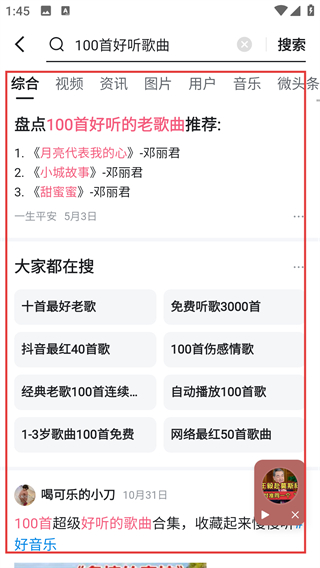 3、搜索结果页会展示相关内容,像【盘点100首好听的老歌曲推荐】这类内容,点进去就能查看详情啦。