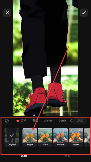 2、进入滤镜面板后,选心仪的滤镜样式,像【Bright】这类,应用后能让图片色调更明亮好看哦。