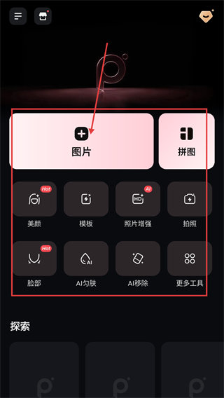 1、在修图工具首页点击【图片】选项,就能进入图片编辑页面,选择要美化的图片开始创作啦。