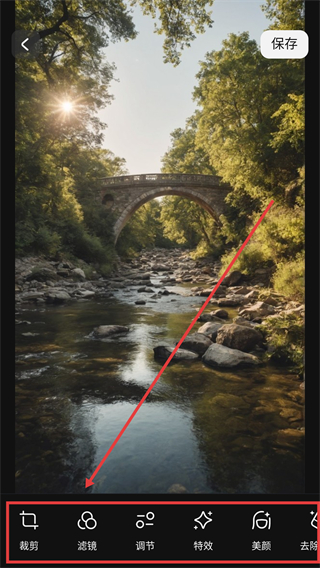 2、进入图片编辑页后,底部会出现【裁剪】【滤镜】等功能栏,点击对应功能就能给图片做调整哦。