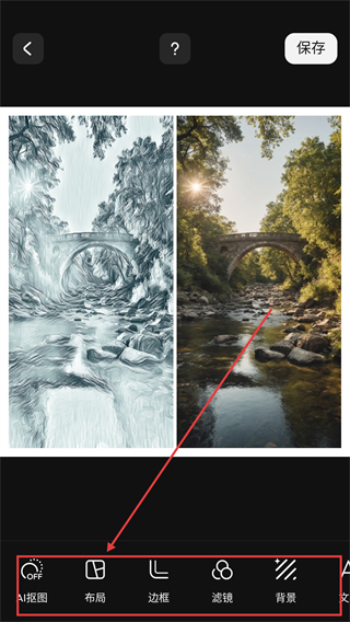 3、切换到拼图模式后,点击底部的【布局】选项,就能打开布局选择界面,挑选喜欢的拼图排版啦。