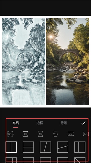 4、在布局选择页挑选合适的比例和样式,选好后点击对勾,就能应用该布局到拼图作品中啦。
