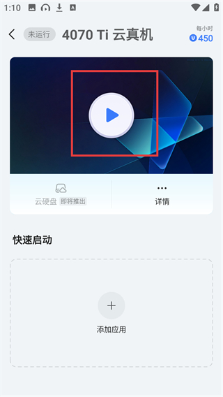3、在云设备详情页点击中间的启动按钮,就能尝试开启该云设备,不过要注意先确认余额是否充足哦。
