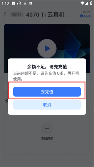 4、若启动时弹出“余额不足”提示,点击【去充值】按钮,就能进入U币充值页面,完成充值后再启动设备啦。