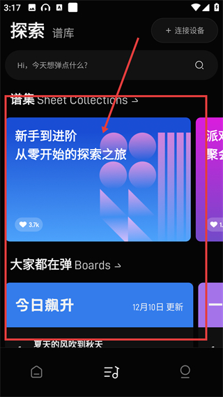 1、在APP的探索页面,点击【新手到进阶】相关谱集,就能进入对应的曲谱列表页面,挑选想弹的曲目啦。